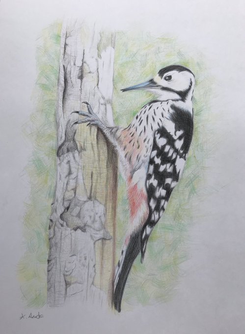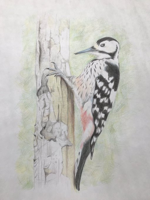あまり変わり映えないのですが、多少手直ししました✨ これでホントに完成にします🌈 #色鉛筆画 #野鳥 #オオアカゲラ #イラスト #絵師