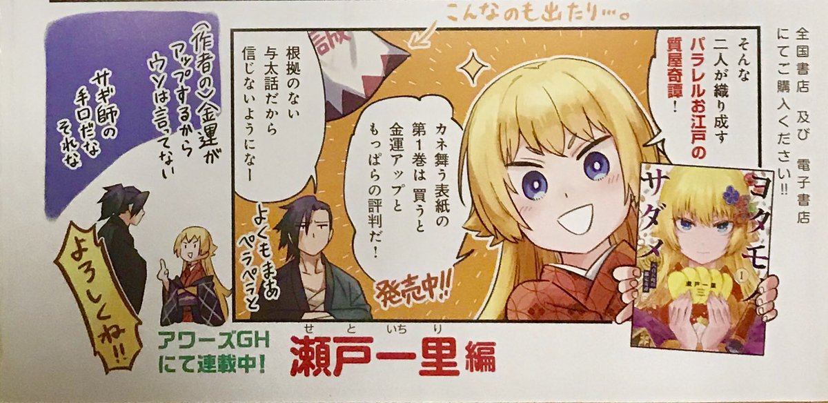 アワーズGHにて連載中のヨタモノサダメ第1巻が4月16日に発売になります! ちょっとパラレルな江戸時代で金髪ロリと与太者が質屋やる話です。目があったら読んでみてくださいー 1話試し読み→shonengahosha.co.jp/tachiyomi/Scro…