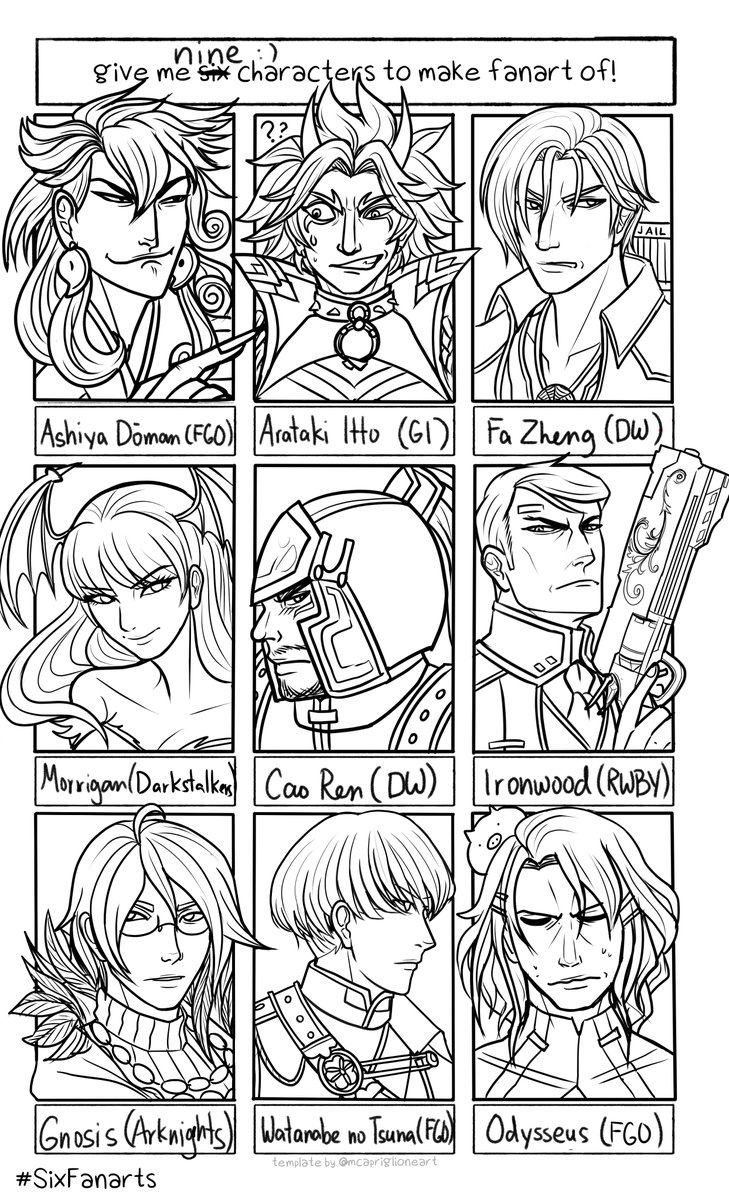 Finally did the linearts for the #SixFanarts thing... XD The ones that stump me tbh was Odysseus and ironwood's Gun because that box was pretty empty.