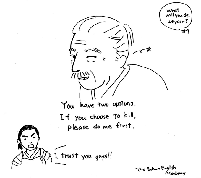 「○○しないと××になるよ」は脅しの言い回しだもんで怖いら〜👹 If you go forward, you will be reborn in the Pure Land of Happiness! If you retreat, you will be sent to the Avici Hell! (進む者は往生極楽!引く者は無間地獄よ!) ダブル平☺️ #どうする家康#どうする絵#歴史英語