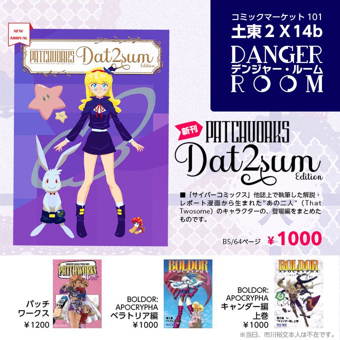 あなたのサークル「デンジャー・ルーム」は、コミックマーケット100で「土曜日東地区 "ル " 52b」に配置されました! webcatalog.circle.ms/Perma/Circle/1… #C100WebCatalog 新刊予定しております(通販あり) よろしくお願いいたします! #混淆世界ボルドー #市川裕文