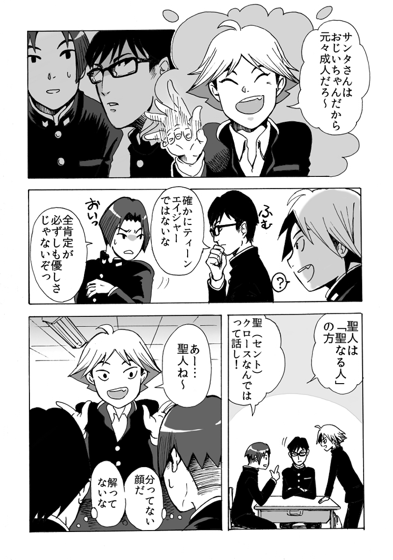 自分では結構気にいってたけどミリも読まれなかった男子高校生のゆるい会話漫画。 最近漫画描いてないな~と思ってフォルダ眺めてたら発掘したので貼ってみる めちゃくちゃ季節はずれなクリスマスネタ。 この3人みたいな関係性のトリオが好きなのだけど… #漫画が読めるハッシュタグ