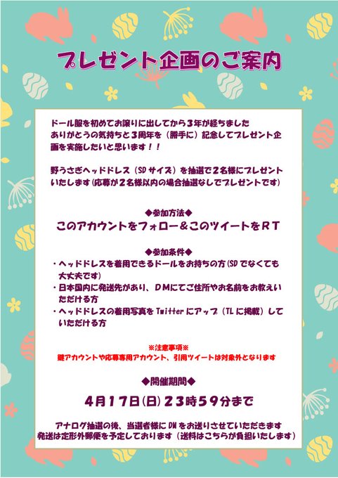 89 76 🎁プレゼント企画🎁 ありがとうの気持ちと3周年を記念して野うさぎヘッドドレスを2名様にプレゼントいたします🎉🐰 参加方法はフォロー&このツイートをRTです🍀 (詳しくは画像をご覧ください) 応募期間は本日~4/17(日)23:59まで 受付期間を長めにとっているのでお気軽にご参加ください☺️ 22/04/08 18:50