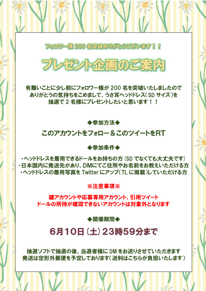 🎁プレゼント企画🎁 フォロワー様200名突破記念✨感謝の気持ちを込めましてSDサイズのうさ耳ヘッドドレスを2名様にプレゼントいたします‼️🐰🐰 参加方法はフォロー&このツイートをRTです🍀 (詳しくは画像をご覧ください) 応募期間は本日~6/10(土)23:59まで⏰ どうぞお気軽にご参加ください🤗