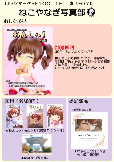 あなたのサークル「ねこやなぎ写真部」は、コミックマーケット100で「土曜日東地区 "リ " 07b」に配置されました!コミケWebカタログにてサークル情報ページ公開中です! webcatalog.circle.ms/Circle/1621730… #C100WebCatalog スペースいただきました!原稿一ミリもやってません!!!!!