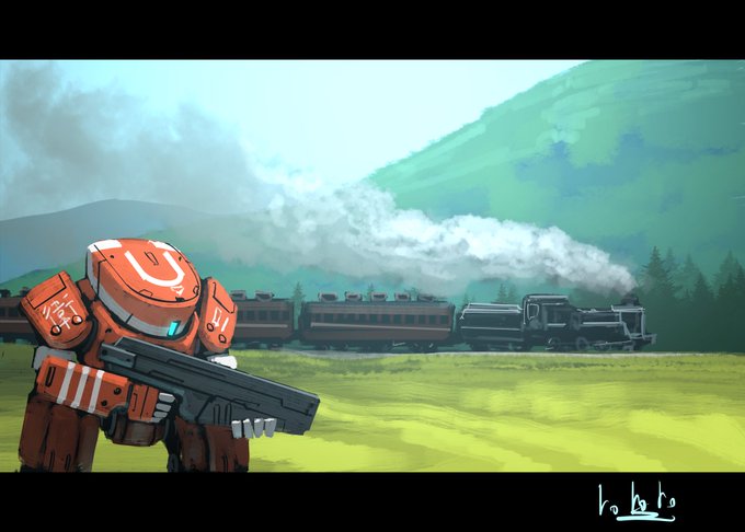 #背景版深夜の真剣お絵描き60分一本勝負 時間外でお題「機関車での旅」 "原風景妨害" 「重点警戒区域とはいえ、これじゃ折角の汽車旅が台無しだよ」 『チッチッチ…通はむしろこの期間限定の風景を楽しむものですぞ』