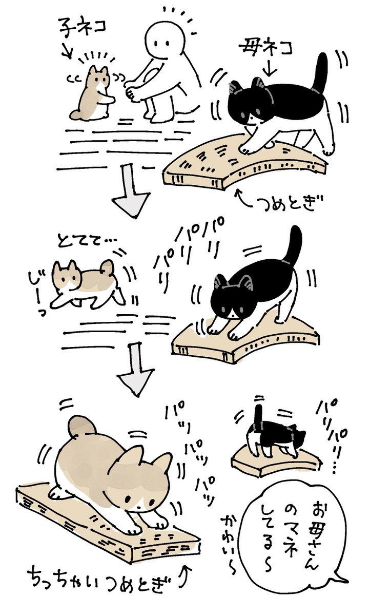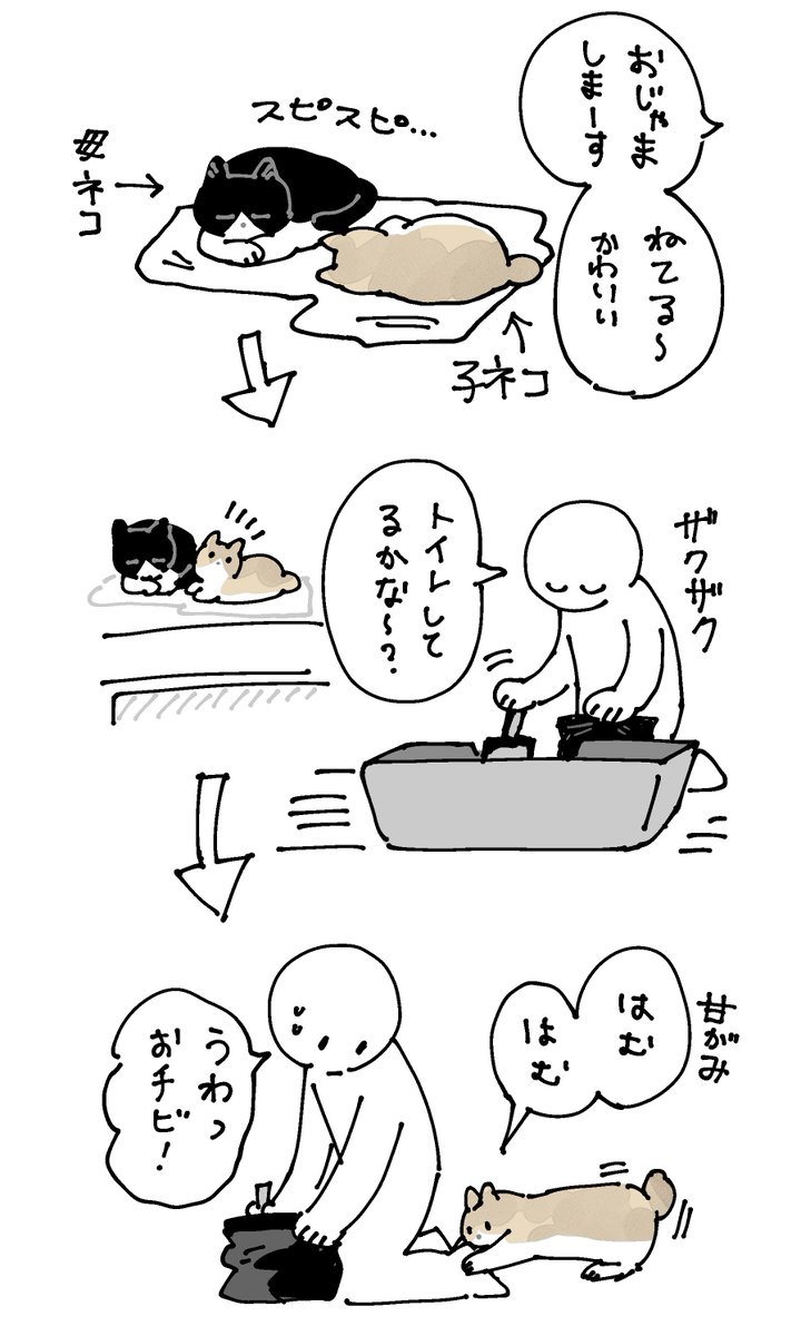 ノラネコさん親子を保護してお家に迎え入れたら、お母さんはめちゃくちゃしっかりしてるし子猫はなんでもお母さんの真似してるしで「(ねこの)親子ってすごいな…」ってなってる絵日記です #ろんの絵日記 (ろんさんいない番外編)