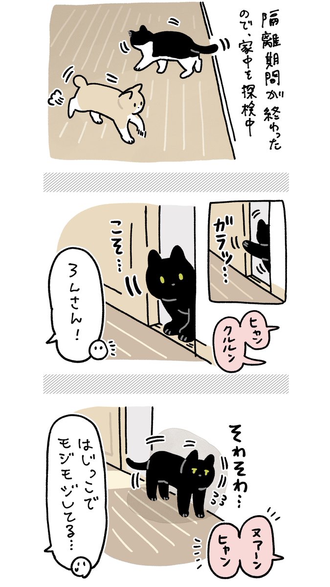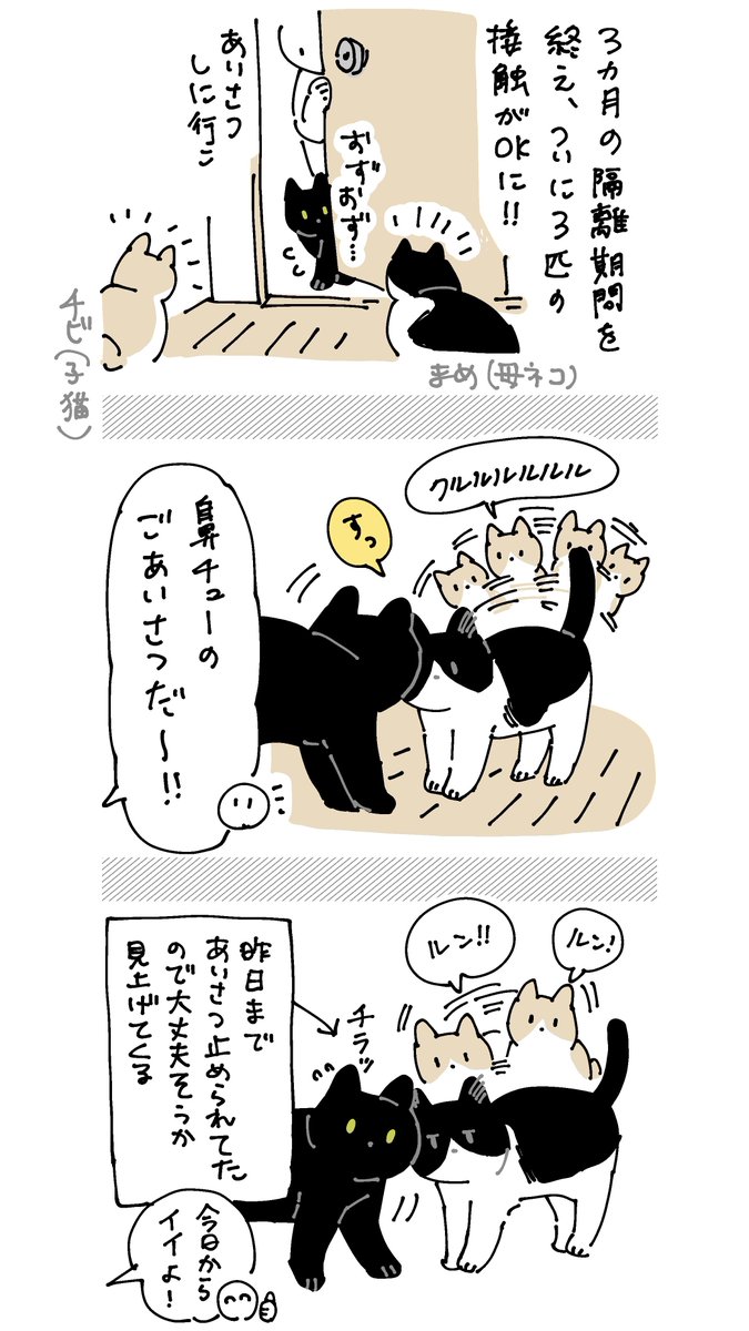 保護猫親子・まめチビの隔離期間が終わって無事ろんさんとあいさつできた #ろんの絵日記
