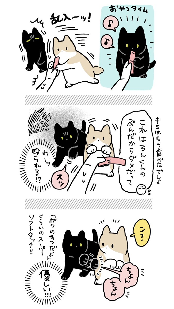 ろんさん、後輩に大好きなオヤツを奪われそうになってるのに全然怒らずに優しく「ボクのぶんです」アピールしてて、なんていい子なんや…てなった #ろんの絵日記