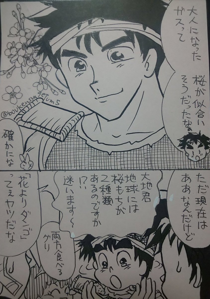 第57回「桜」大地はひまわり、ラビはユリ、ガスはたんぽぽ大人になったら桜と思っております。桜色の紙使う時に失敗するとは😅悔しいのう、悔しいのう。 #GZ版まったり創作60分一本勝負 #GZ30周年祭り