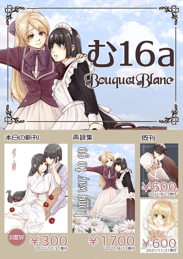 12/31 コミックマーケット101のおしながきとサークルカットです 新刊は女中さんとお嬢様の主従百合、既刊はメイド百合とかおやゆび姫の百合とか コミケのWebカタログにもサンプルとかまとめて載せてます よかったら見てやってくださいー webcatalog-free.circle.ms/Circle/16809784