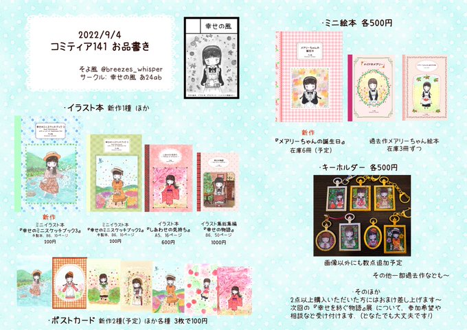 遅くなりましたが5/5コミティア140のお品書きです. 新しいミニイラスト本,ポストカード,キーホルダーや,珍しいミニ原画も用意しました.グループ展での新作や過去作のポストカード,絵本,イラスト本などもあります. お立ち寄りいただけたら嬉しいです…! #コミティア140お品書き #コミティア