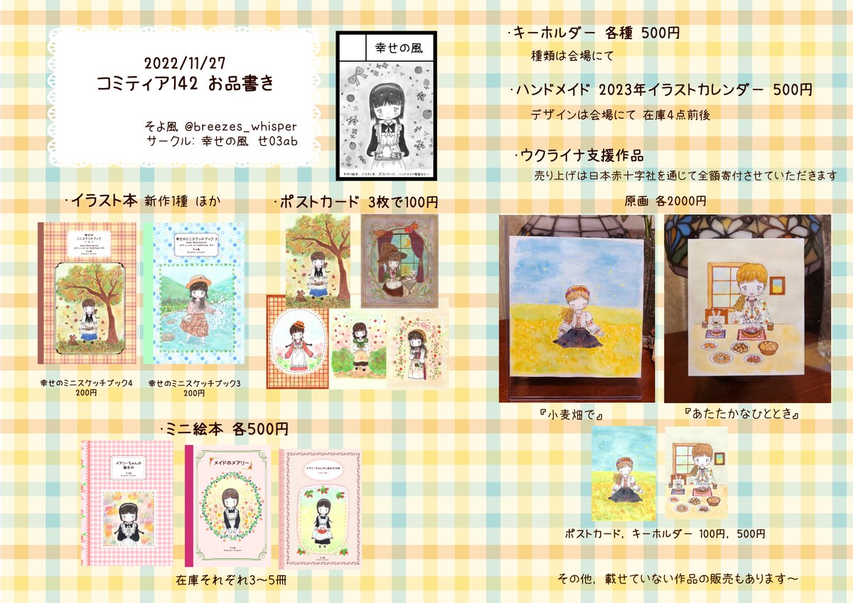 11/27 コミティアのお品書きです. ミニイラスト本,ポストカード4種,来年のカレンダー,原画2種が新しい作品です. 初めての試みとしてウクライナ支援の作品を販売します.売り上げは寄付させていただくので,ぜひ見ていただけたらと思います. #コミティアお品書き #コミティア142