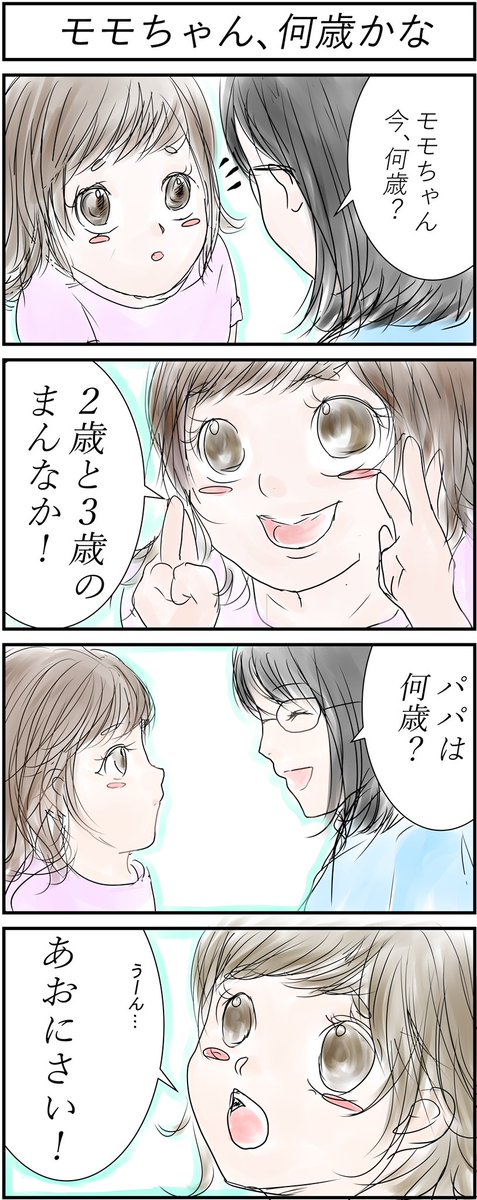 2歳半頃の娘の可愛い回答(*´꒳`*) ちなみにママは3歳らしいです。 #イラスト好きな人と繋がりたい #絵描きさんと繫がりたい #みんなで楽しむTwitter展覧会 #4コマ漫画 #イラスト #似顔絵