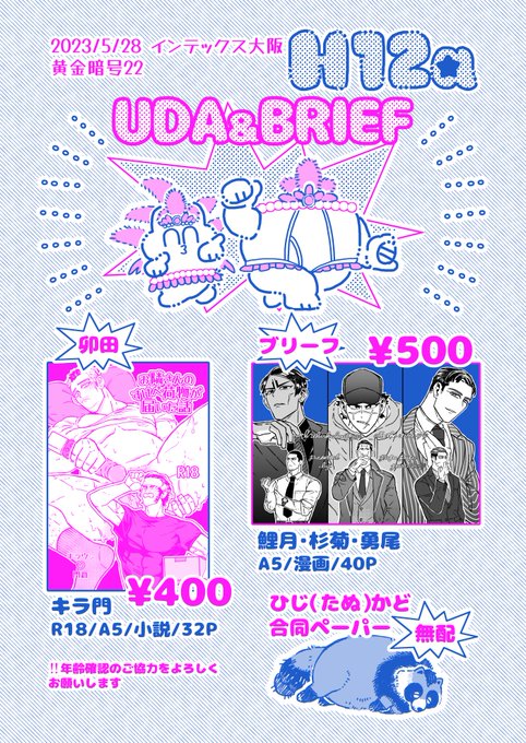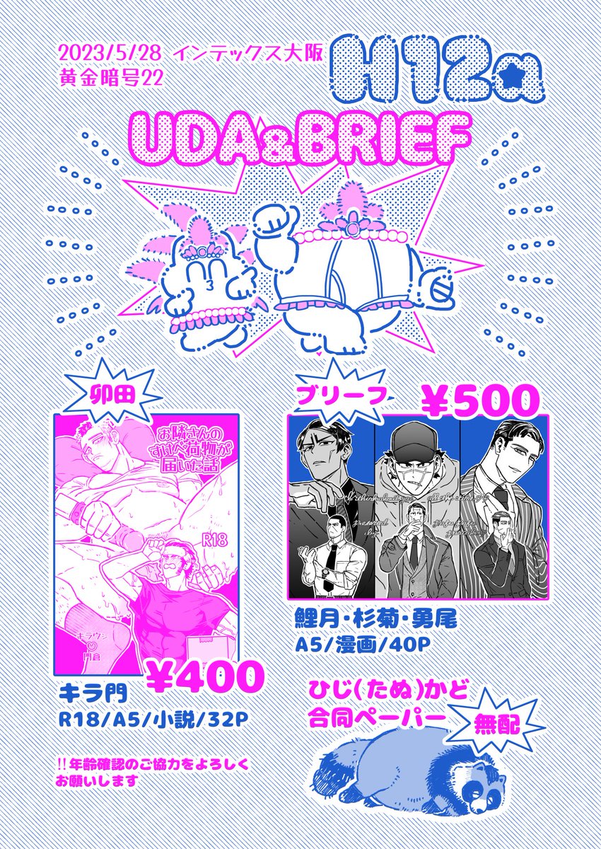 23 83 5月28日黄金暗号22💙💗2号館H12a💙💗UDA&BRIEF💙💗おしながき💙💗 卯田さん【@udauda_3】と合体サークルです💙💗 卯田さんはピンク色のキラ門本、ブリーフは青色の鯉月・杉菊・勇尾ごちゃまぜ本がそれぞれあります💙💗ひじ(たぬ)かどの無配合同ペーパーもあります💙💗 23/05/25 13:24