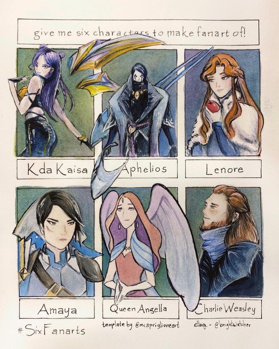 My #SixFanarts contribution! I asked my followers on IG for suggestions and here they are! 💕 . . . #kdakaisa #LeagueOfLegends #Castlevania #TheDragonPrince #Aphelios #lenore #SheRa #queenangella #harrypotter #charlieweasley