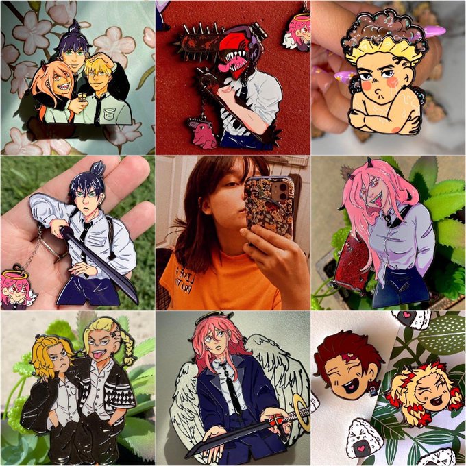 Purrr 💅🏼 here’s my #artvsartist2021 anime pins edition. 😖 my pins deserve love too 🤧🤧 If you weren’t awareee I design and make these bad boys too 💜 #chainsawman #JujutsuKaisen #TokyoRevengers #DemonSlayer