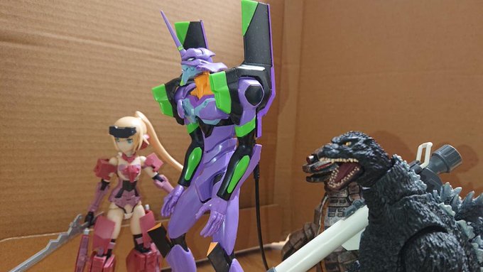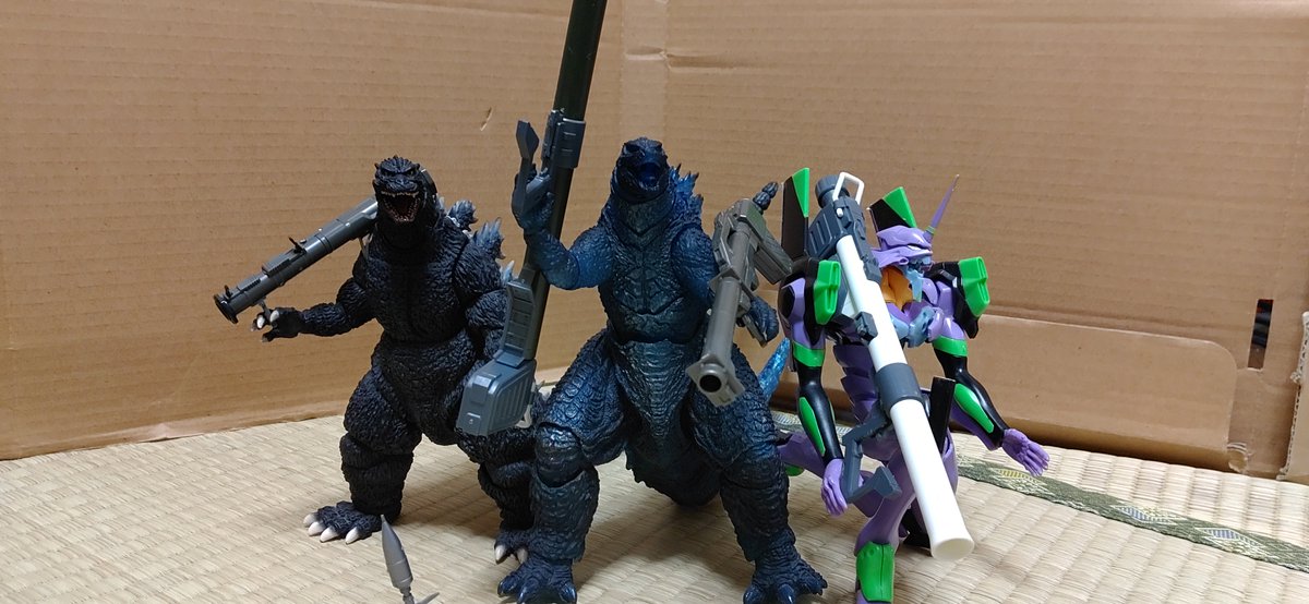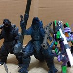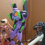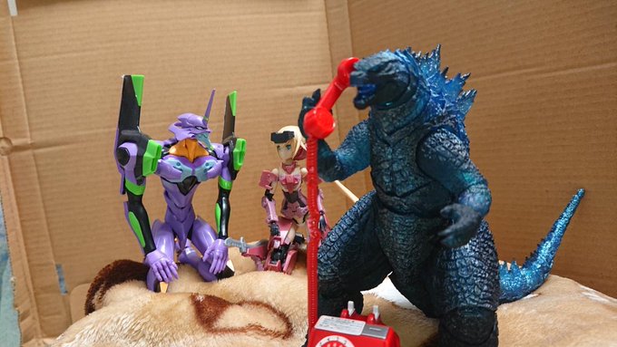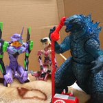 電話するゴジラ それを見守る初号機くんと迅雷さん(∩´∀`)∩ #オモ写