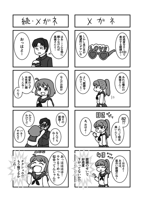 好感度を数値化する眼鏡の漫画 #漫画が読めるハッシュタグ #4コマ漫画 #創作漫画 画質がアレだったんで出力し直して上げ直しました 反応くれた人すみません