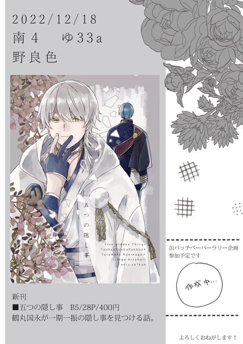 2022/12/18 つるいちもんめ15 【南4 ゆ33a 野良色】 新刊しかないですけどお品書き作りました! pixiv→pixiv.net/artworks/10325… 新刊通販→ecs.toranoana.jp/joshi/ec/item/… よろしくお願いします!