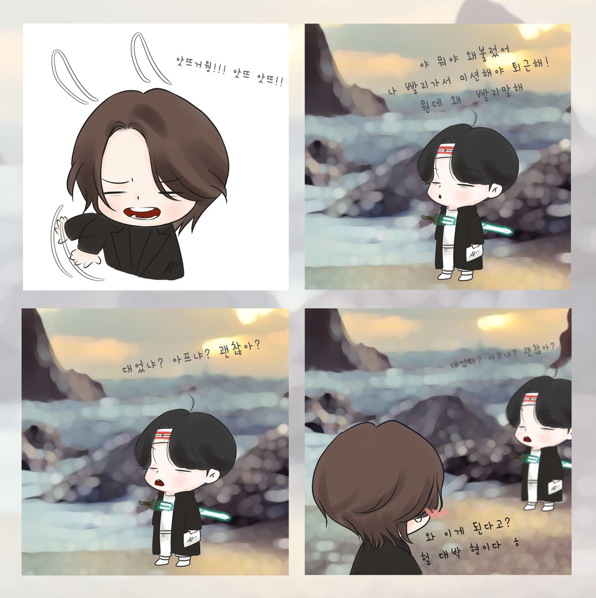 🐱: 으어.... 앞이... 🐹: 그럼 이렇게 묶으면 되지이~! 꺄하핫! 🐱:아니이... 웅... 에효.. twitter.com/dtx309/status/… #SUGA #어라, #시원은하네 #진형땡큐 #JIN @BTS_twt #btsfanart #fanart