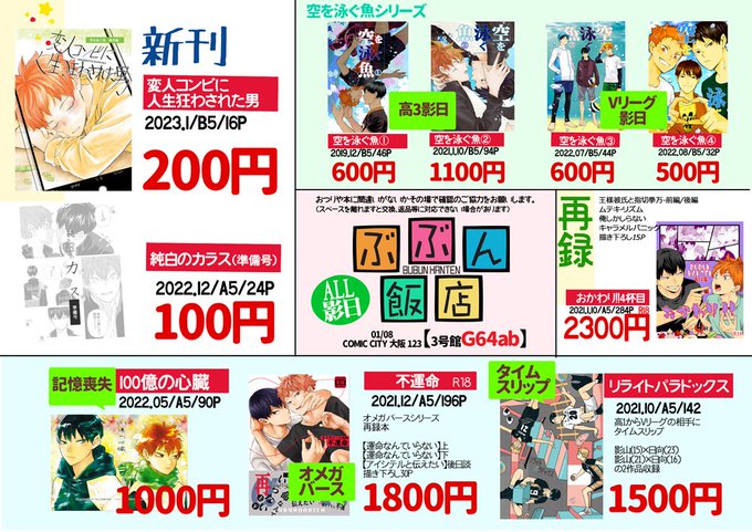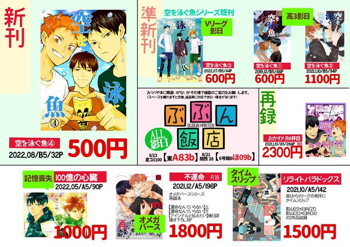 6/25のお品書きになります【影日】 こちらに載ってる既刊は、イベント後虎の穴に追納される可能性があります 当日はよろしくお願いします🙇 pixiv→【6/25】おしながき【影日】 | ぶぶん飯店(一樹らい)pixiv.net/artworks/10927… #かげひなバースデーパーティ0625