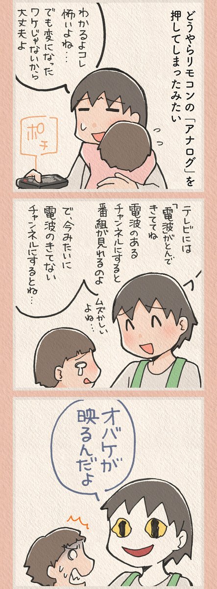 0 7 3歳娘の怖いものの話。テレビの砂嵐は、大人でもずっと眺めてると不安定になる。夜中に見ると明日死ぬ人の名前が出てくるとか、そんな都市伝説なかったっけ。 ところでメディア砂漠、あんまり通じる人がいなくて悲しい! #育児漫画 #育児絵日記 #コミックエッセイ #エッセイ漫画 #3歳 #天才てれびくん 20/12/16 20:45