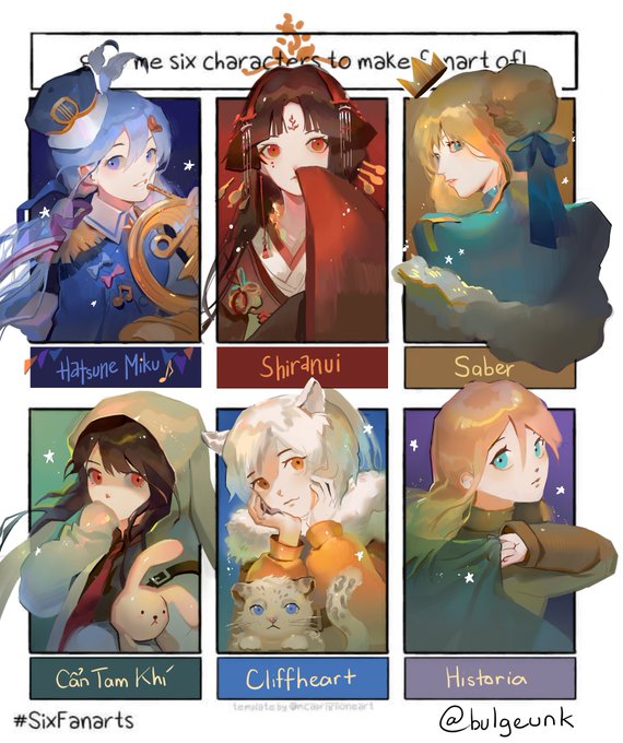 Look who is so slow to jump into the trend lol, I have fun drawing them, thank you everyone for the recommendation!! #SixFanartsChallenge #SixFanarts #HatsuneMiku #VOCALOID #Shiranui #onmyoji #Saber #FateGrandOrder #CanTamKhi #Cliffheart #明日方舟 #アークナイツ #HistoriaReiss