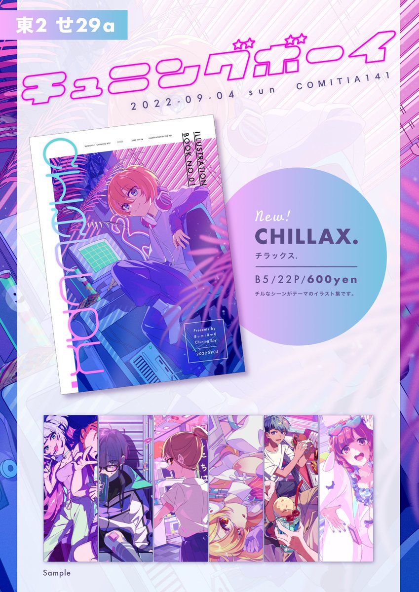 【お知らせ】 9/4のコミティアに新刊イラスト本 『CHILLAX.』持っていきます〜! B5/22P/600円(会場価格)予定です! こちら表紙とサンプルです。 ▼通販予約も開始しました💫 melonbooks.co.jp/detail/detail.… #コミティア141 #COMITIA141