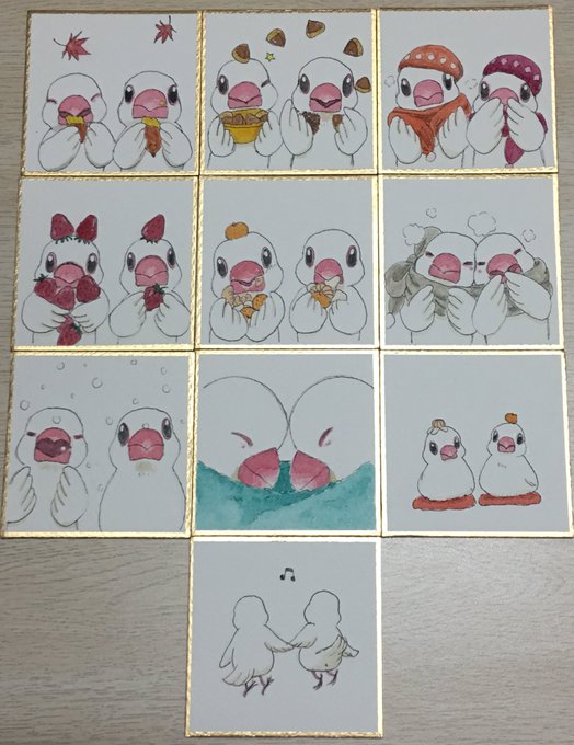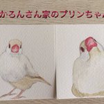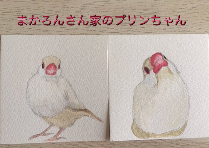 7 53 以前描いた下絵、3枚だけ色塗りしました! 何故か色塗り始めると異様な眠気に襲われて……全然色塗りが進まず……やっと今日進めれました……💦 #文鳥イラスト #水彩画 19/08/29 12:35