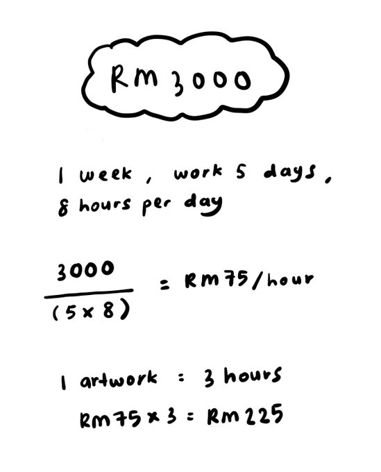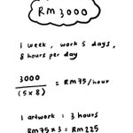 Sometimes it is hard to price an artwork so most of the new ones akan letak low prices. Here’s how to do a simple calculation. 1st, you need to know your living cost/ gaji yang u nak, then you calculate per hour. Let’s say living cost in KL is rm3000. twitter.com/samruzone/stat…