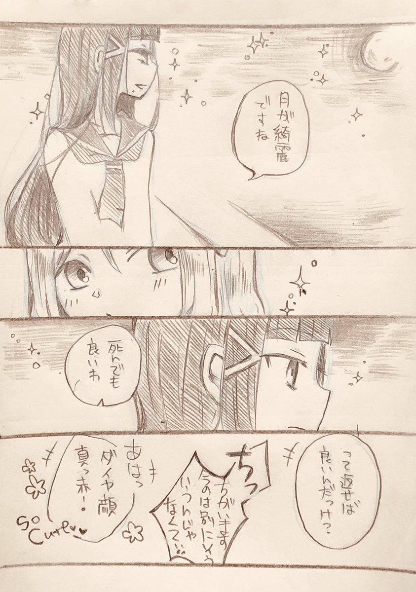 「月が綺麗ですね」 ダイマリ記念日4月分納税。 付き合ってるダイマリで考えて描いたけど付き合ってない状態でこの会話してても大変美味しいと思います!!!!! #毎月5日はダイマリ記念日 #ダイマリ広報部