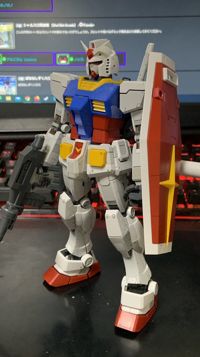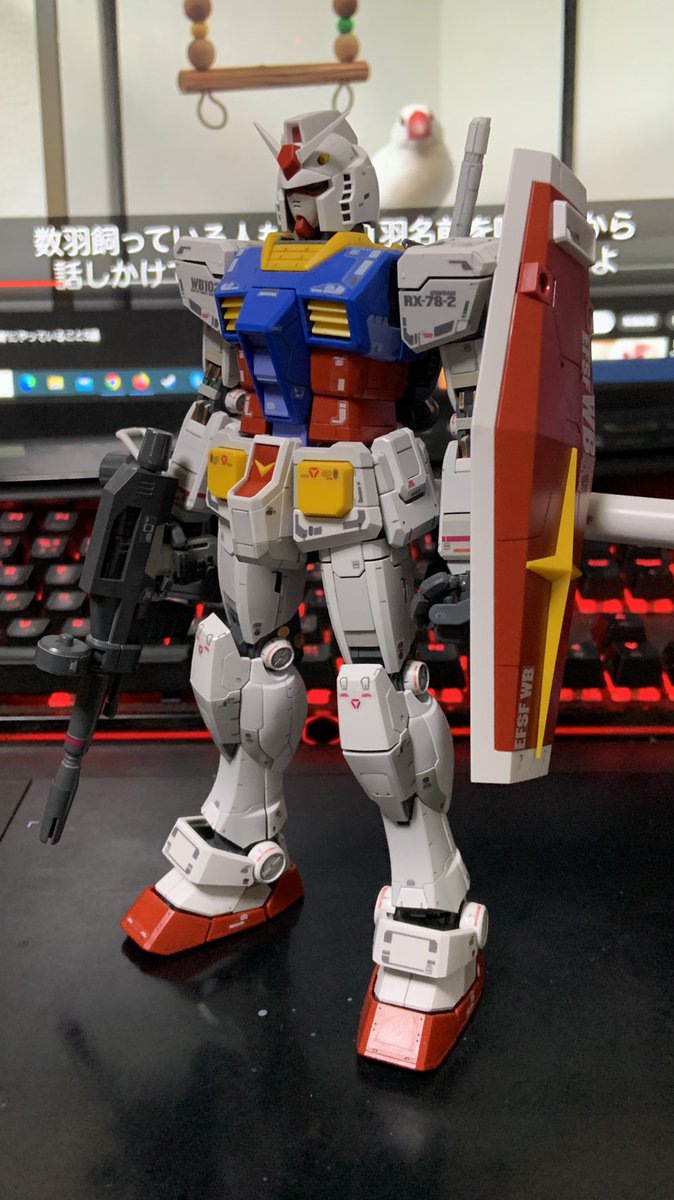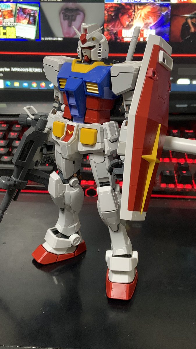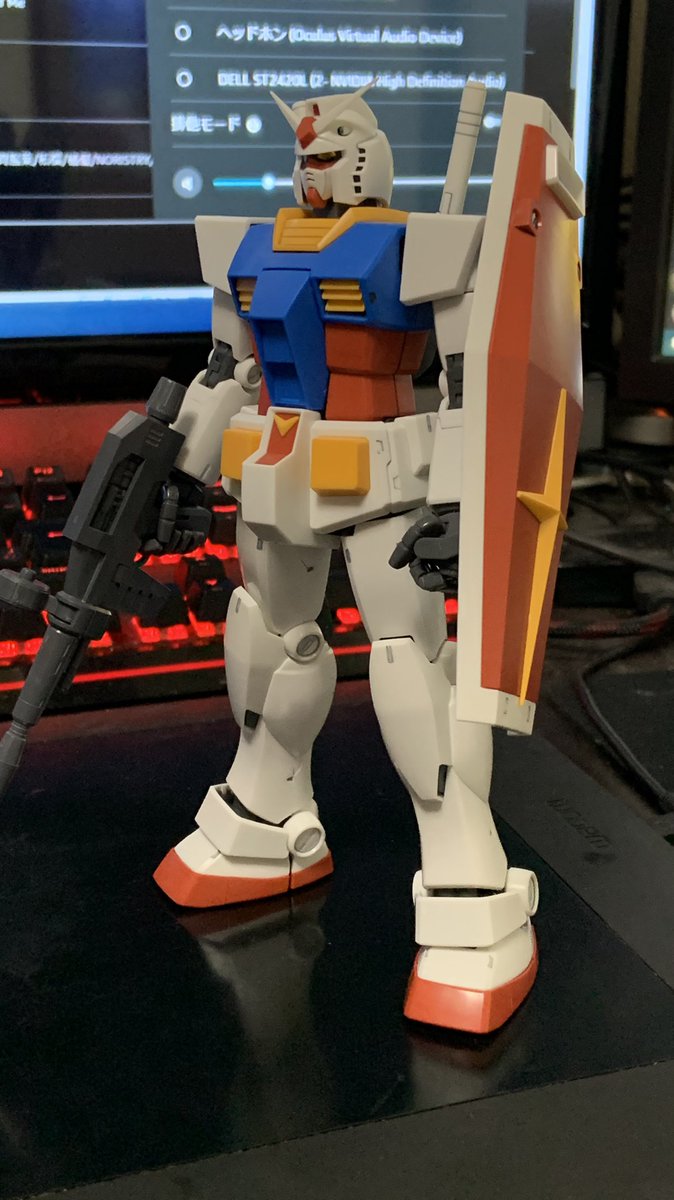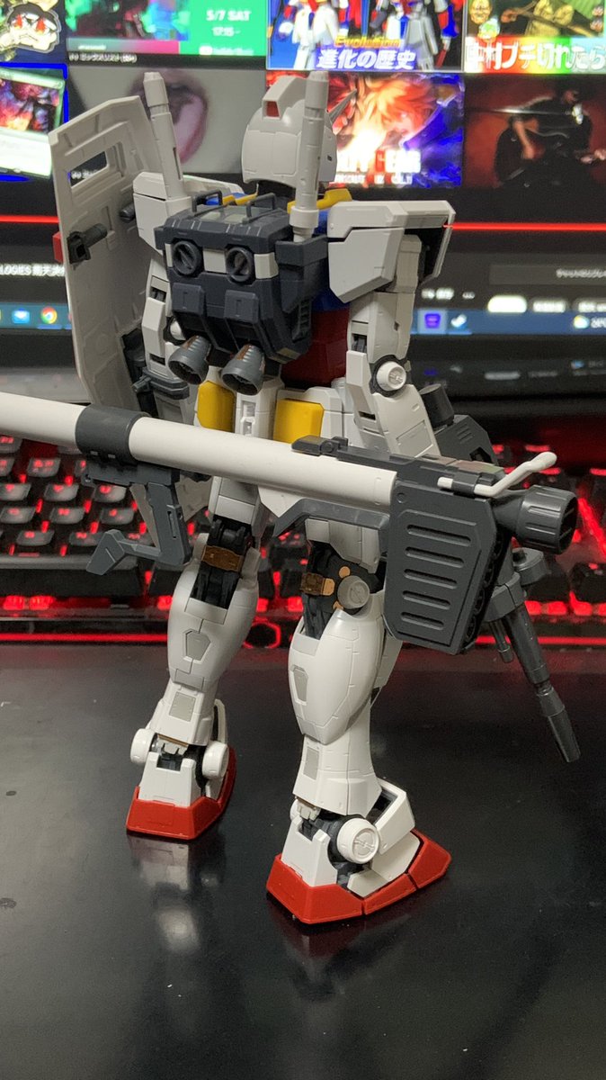 MG RX-78-2 完成ー!! RGのRX78-2を更に細かくして大きくしたような感じで、シンプルなデザインながらギミックも多く、非常にカッコいい!! ただ、唯一の難点があり、RG同様リアリスティックデカールの金属光沢がすぐ剥げてしまうのが、出来がいい故に非常に残念でした…… #ガンプラ