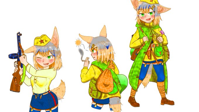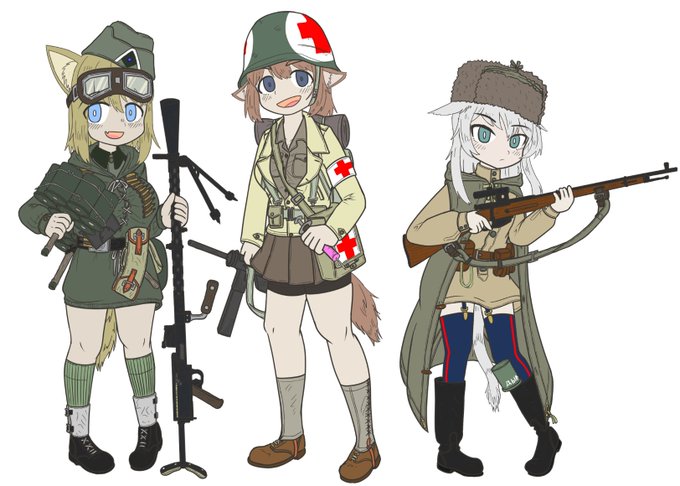 ケモミミ分隊 機関銃手の工兵ちゃん(ドイツ風) 狙撃手の斥候兵ちゃん(ソ連風) 短機関銃の衛生兵ちゃん(米国風) あ、過去絵です