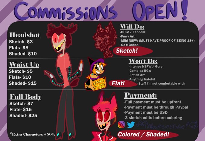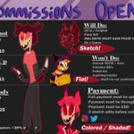 Heya! I don’t want to get too far in to it, but recently an incident happened so yeah! Starting today commissions will be open for anyone seeking to buy!! 😊❤️ #commissionsopen #HazbinHotel #HelluvaBoss #ArtistOnTwitter #MyArt #OcArt