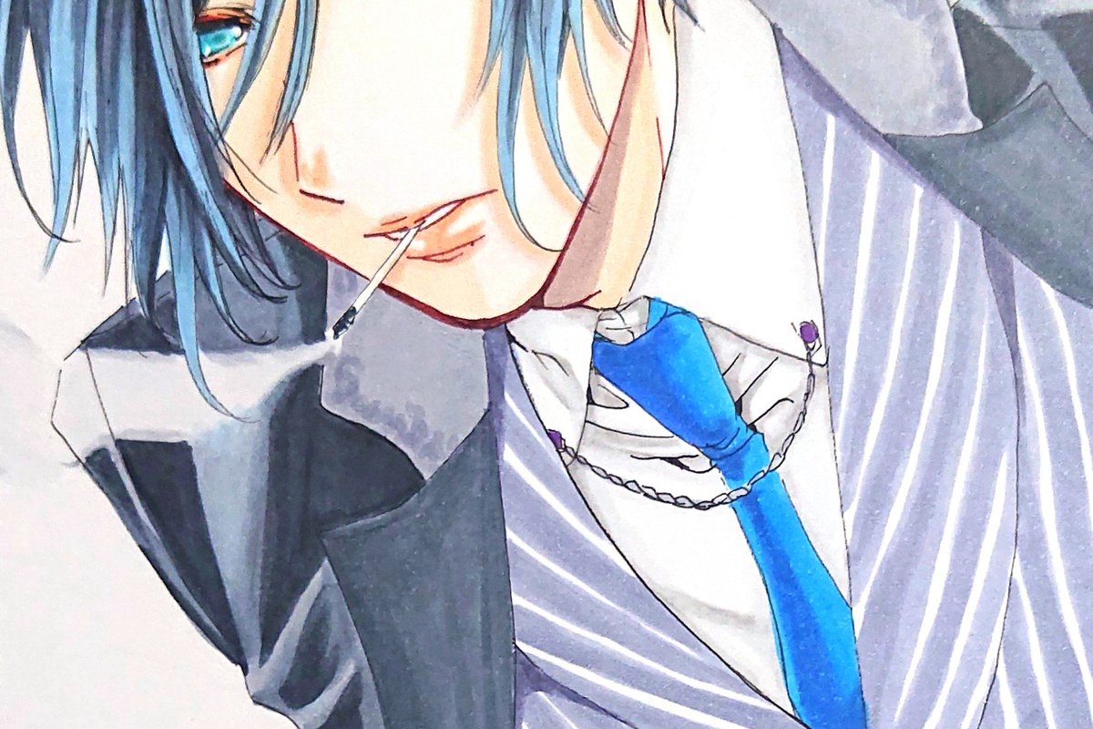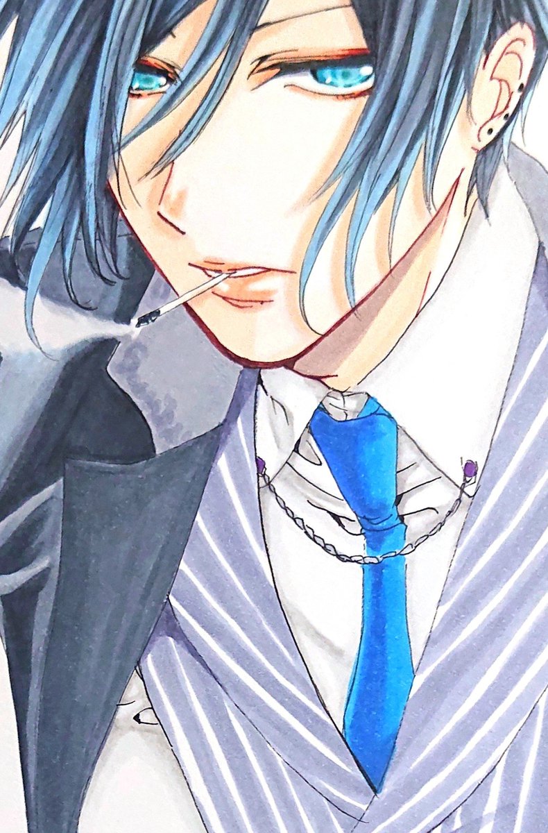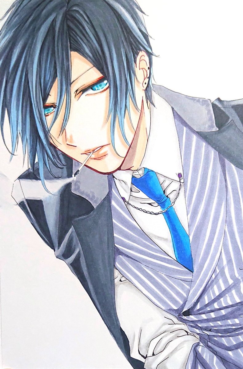 今度は男性。 タバコと黒髪(黒と青の組み合わせ)とストライプ柄好きなのー! #アナログイラスト #コピックイラスト