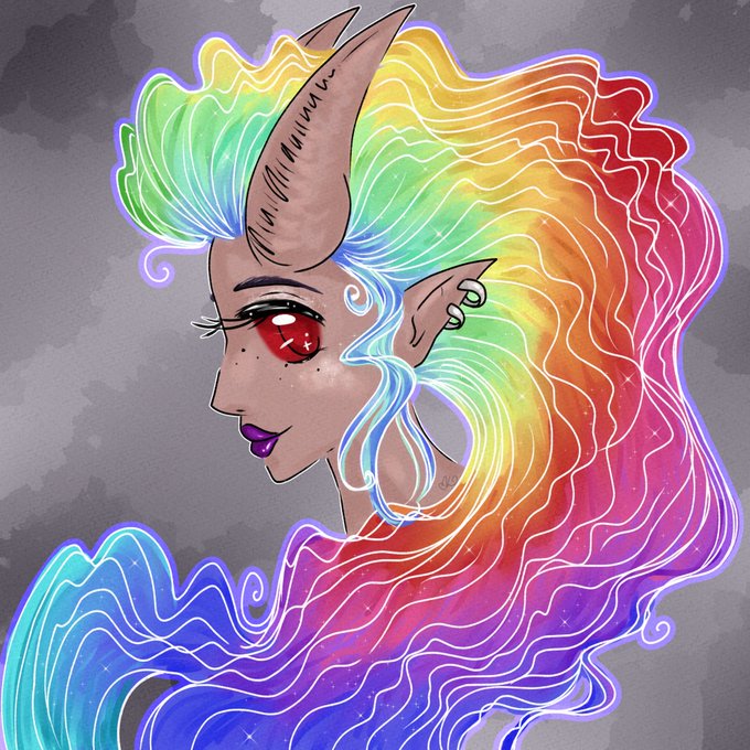 My #tiefling w/ an illusion spell on her hair. 🌈Inspired by a Insta DTIYS. #dnd #rainbow #digitalart #cuteart I am working on paying fees for events this yr, if you enjoy my work💜Buy me a coffee or check out my shop. I also have comms open!✨ ko-fi.com/kadoodles