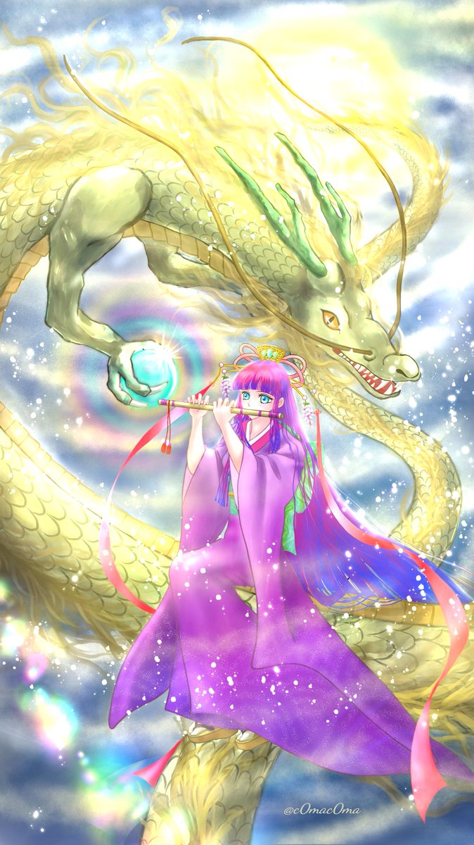 タップ推奨 ❢ (≒携帯待受サイズ) ライン友へのリクエストにお答えして描きました♪ お題…『龍笛🐲』 アイコンとしても使えるよう、龍と女性の顔を近づけました♪アップ画像はスレッドに↓ #イラスト #イラスト好きな人と繋がりたい #龍 #創作イラ