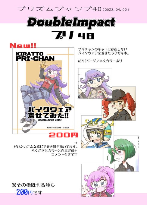 ■4/2 プリズムジャンプ40|お品書き (プリ48 DoubleImpact) 新刊は告知通り「めるめる達にバイクウェア着せたら絶対可愛いという幻覚をそのまま描いたらくがき本(200円)」です。 よろしくお願いしますー ※その他既刊各種も今回全て200円に統一します #プリジャン40