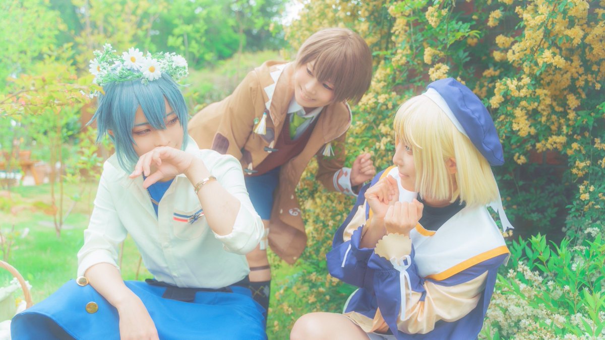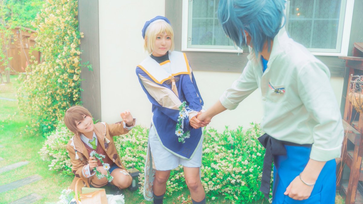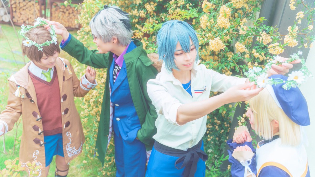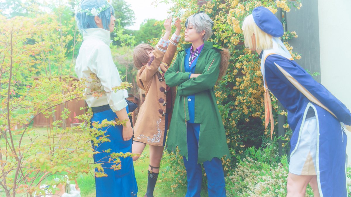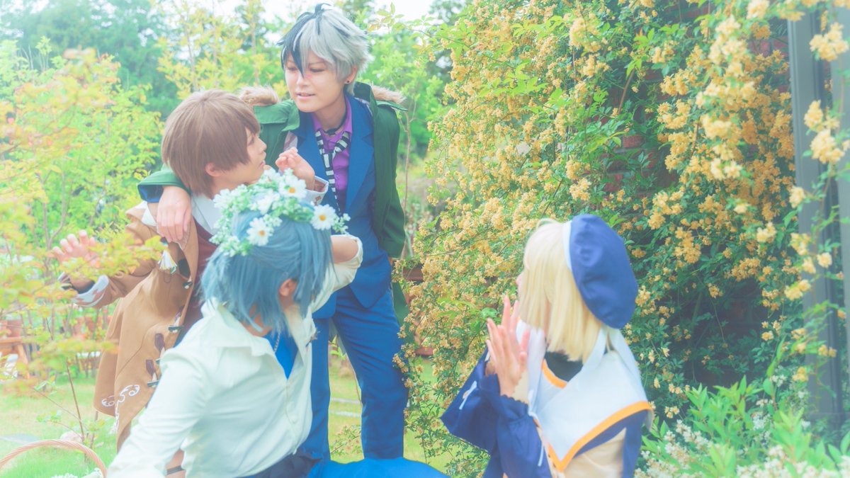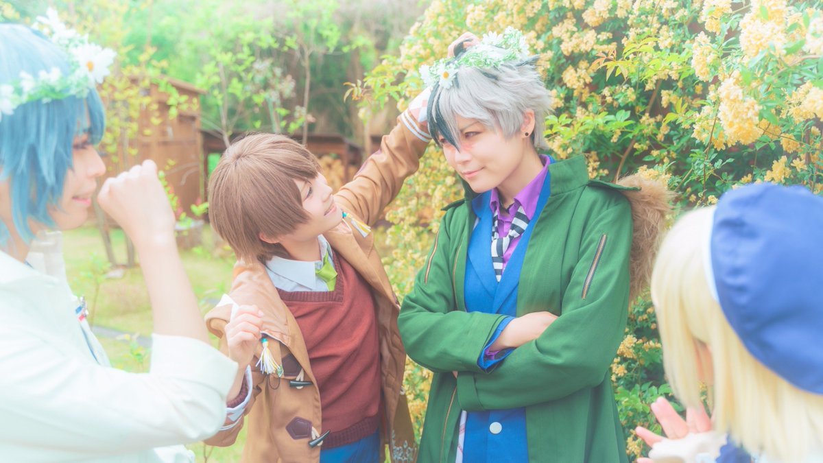 【花冠の作り方】(2/3) 「ネロもこっちに来てください」 「俺はいいって」 「わっ!ネロさんもお似合いですよ!」 「楽しそうなことやってんじゃねぇか」 「げっ」 #まほやく_cos ミチル:@yrfw_anr リケ:@220_hikari ネロ:@mariram_1002 ブラッドリー:@2x_EN