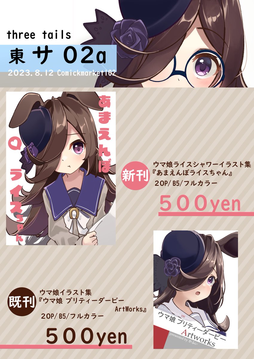 67 160 あなたのサークル「three tails」は、コミックマーケット102で「土曜日 東地区 “サ” ブロック 02a」に配置されました! 新刊はライスちゃん本の予定です! よろしくお願いします😊 #C102 23/06/09 21:27