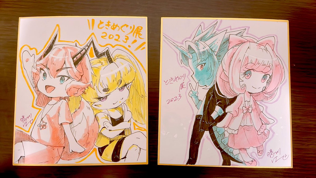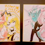 #七宗イラストアート展 本日の戦利品(1枚目) @chiechiineko @chan_saku2021 @chococoa7777 @miniikoyo @YuunyaHime @haruyukivv @OugiPanda07 ガチャくじで鮎神タペストリー当たりました ご利益 以前のビンゴで千枝さんの色紙リク当てた件のも受取(2枚目) かわいいしかない(語彙力迷子)