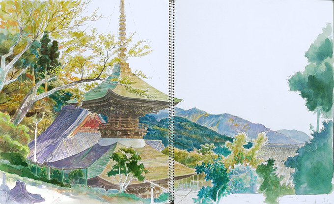 『秋の寺』『Autumn Temple』 f8×2 水彩絵の具 #水彩画 #Watercolor #スケッチ #風景画