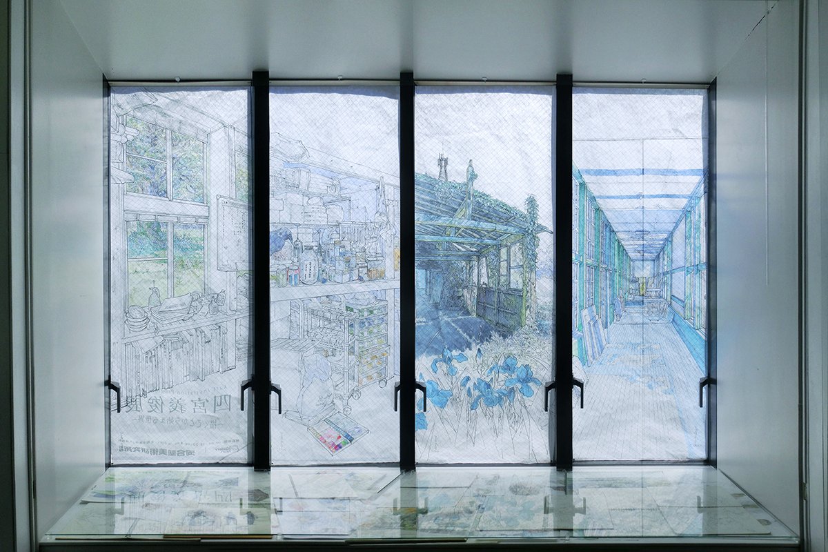 薄い紙なので透けます。 アトリエ四景01 H1770mm x W635mm x 4枚 水彩絵の具 筆ペン ロール石州紙 #水彩画 #Watercolor #スケッチ #風景画