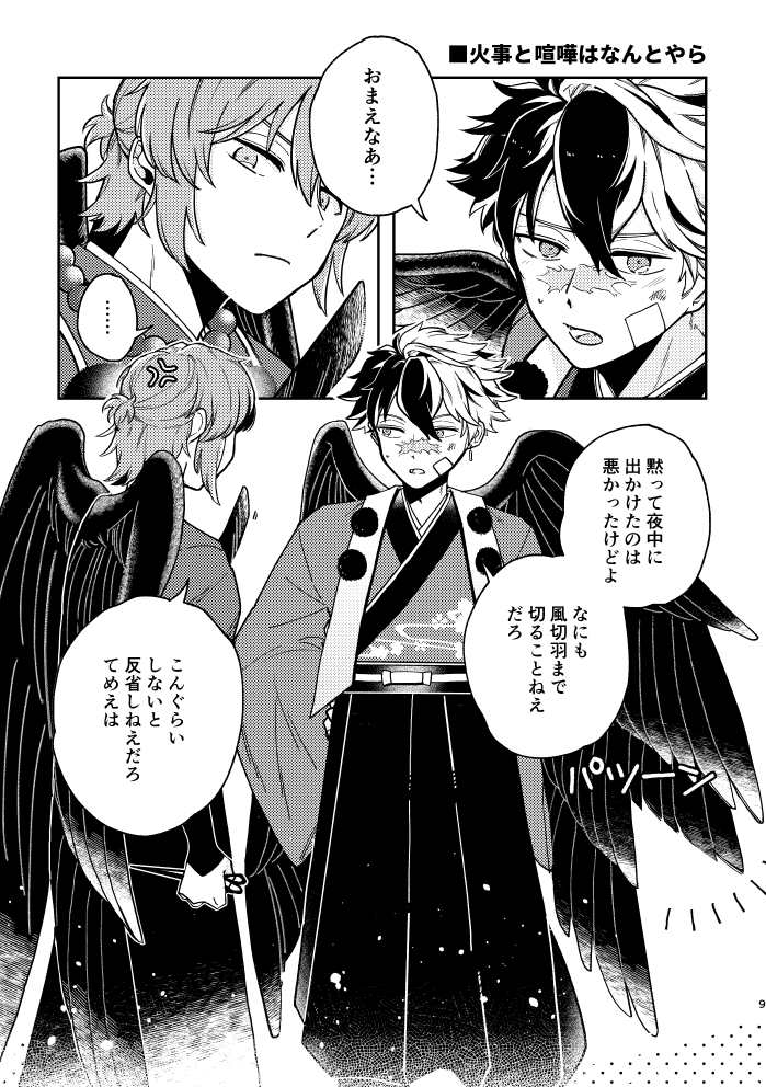 4/17そういうブラネロ5で展示していた天狗たちが揉める漫画でした。見てくださった方はありがとうございました! ※1P目記載の通り、羽を切る表現がありますのでご注意ください。 #そういうブラネロ5アフター