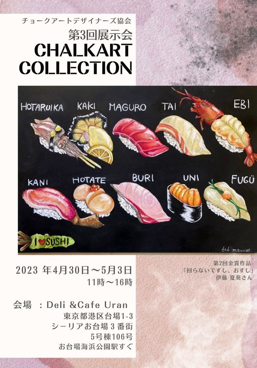 4 5 🌸第3回 CHALKART COLLECTION🌸 スナネコを展示販売します。 原画サイズは20cm角🐈 価格は5,000円(送料別) ■日時:2023年4月30日(日)~5月3日(水) 11:00~16:00 ■場所:東京都港区台場1-3 シ-リアお台場3番街5号棟106号 Deli&Café Uran 🚃お台場海浜公園駅から徒歩2分 #チョークアート 23/04/25 19:01