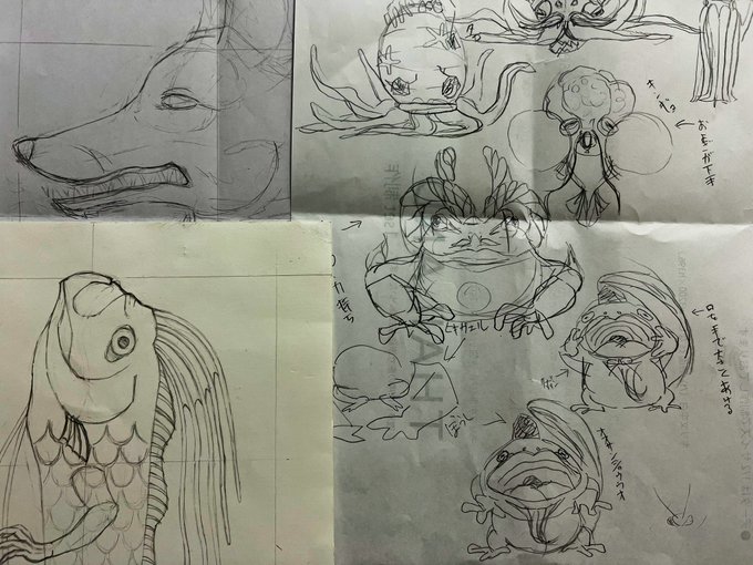 ラフ画✏️ リュウグウノツカイやオオサンショウウオ、ヒキガエル、金魚の妖怪など。 #イラスト