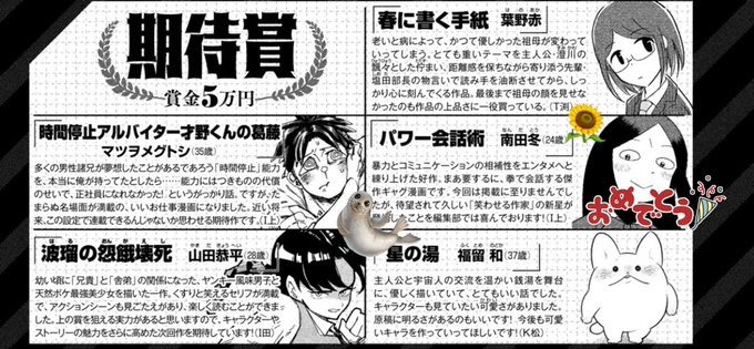モーニング月例賞2023年3月期にて期待賞をいただきました!え!5万円じゃん!ラッキー!今度はもっとでかい賞取ります。応援よろしくな!
