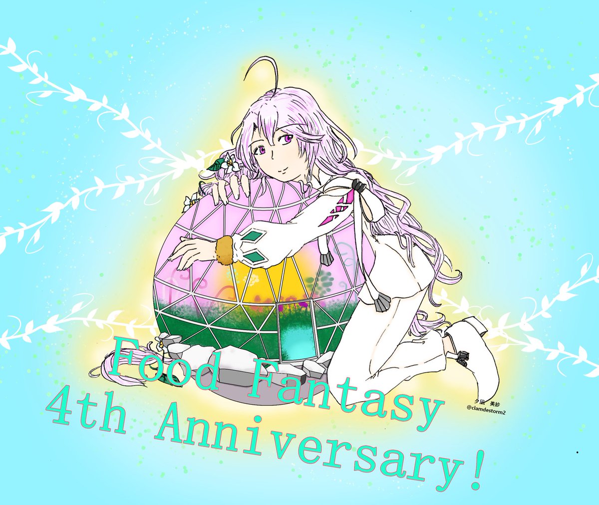 フーファン四周年、おめでとうございます!! これからもたくさんの食霊達と共に、楽しんでいきたいです!! #フーファン四周年 #フーファン四周年お祝いイラスト twitter.com/foodfantasyJP/…