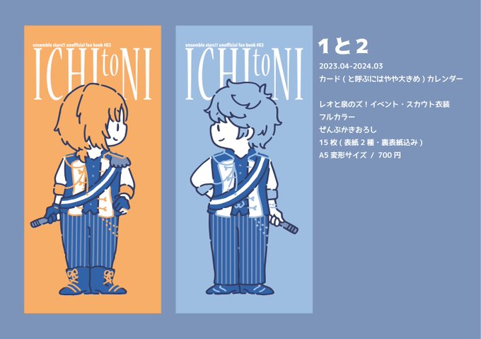 18 120 新刊サンプルのお知らせ 『ICHItoNI (1と2)』 2023 4月始まりカレンダー レオと泉のズ!衣装 フルカラー、オールかきおろし A5変形サイズ 表紙2種、裏表紙込み15枚 3/19 BOOTH にて通頒予定です 23/03/17 19:00